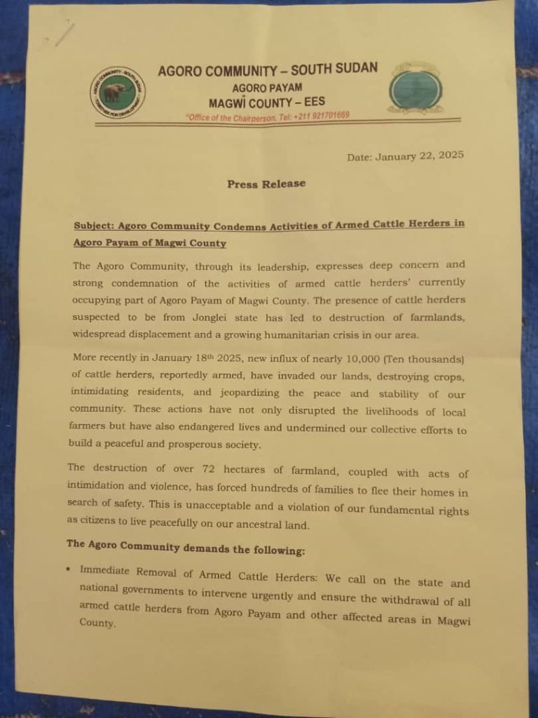 On January 31, 2025, the herders reported that their cattle camps in Nyolo village were attacked by the communities. The attacks prompted reactions from Jonglei State authorities, with some describing the raids as “organized.” A lawmaker in the South Sudan National Legislative has called for de-escalation of the tensions.