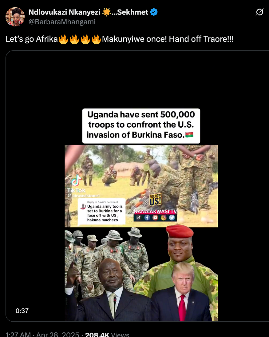 This post on X (formerly Twitter) claiming that Uganda has deployed 500,000 troops to Burkina Faso is FALSE.