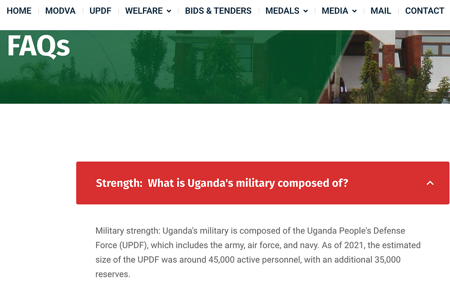 Uganda’s entire military, the Uganda People’s Defence Force (UPDF), has about 45,000 active personnel, according to statistics published on the Ministry of Defence and Veteran Affairs website.